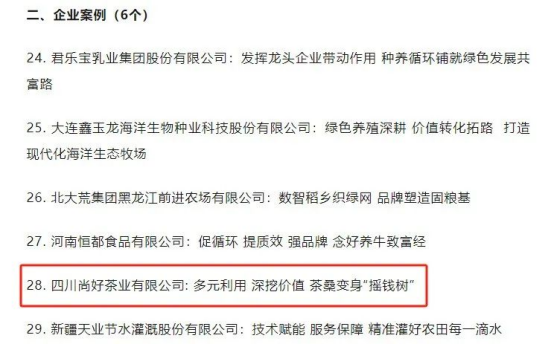 近日,農(nóng)業(yè)農(nóng)村部發(fā)布第三批農(nóng)業(yè)綠色發(fā)展典型案例,四川尚好茶業(yè)有限公司憑借《多元利用深挖價值茶桑變身“搖錢樹”》成功入選企業(yè)案例,成為全國農(nóng)業(yè)綠色發(fā)展的示范標桿。此次評選由農(nóng)業(yè)農(nóng)村部組織專家嚴格論證,旨在推廣各地推進農(nóng)業(yè)綠色轉(zhuǎn)型的先進經(jīng)驗,尚好茶業(yè)作為四川省唯一入選的茶桑綜合開發(fā)企業(yè),標志著公司在生態(tài)農(nóng)業(yè)、產(chǎn)業(yè)融合和可持續(xù)發(fā)展領(lǐng)域的實踐成果獲得國家級認可。