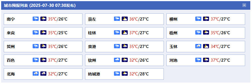 預(yù)計(jì)7月31日白天,廣西全區(qū)以多云為主,分散性陣雨或雷雨 “隨機(jī)打卡”。其中,玉林、梧州、賀州、貴港、來(lái)賓、北海、欽州、防城港、南寧、百色等市的局地有暴雨,還伴有短時(shí)雷暴大風(fēng)等強(qiáng)對(duì)流天氣。值得注意的是,受臺(tái)風(fēng) “竹節(jié)草” 外圍下沉氣流影響,即便雨水 “到訪”,廣西大部地區(qū)最高氣溫仍維持在35℃左右,高溫主要位于桂北、桂西,有34~36℃,局地超37℃;其他地區(qū) 31~34℃,局地可達(dá) 35℃以上,全區(qū)體感悶熱。昨天廣西氣象臺(tái)繼續(xù)發(fā)布高溫四級(jí)預(yù)警。