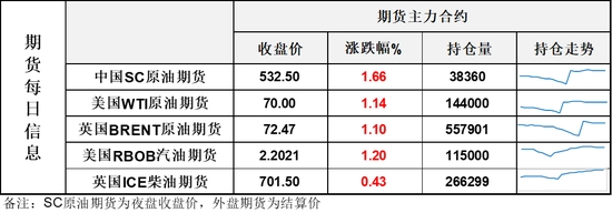 【1】WTI主力原油期貨收漲0.79美元,漲幅1.14%,報(bào)70美元/桶;布倫特主力原油期貨收漲0.79美元,漲幅1.1%,報(bào)72.47美元/桶;INE原油期貨收漲1.66%,報(bào)532.5元。