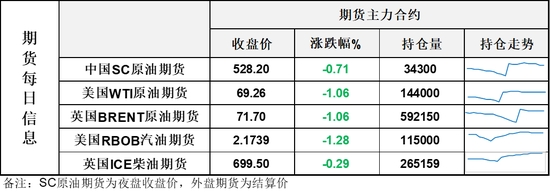 【1】WTI主力原油期貨收跌0.74美元,跌幅1.06%,報(bào)69.26美元/桶;布倫特主力原油期貨收跌0.77美元,跌幅1.06%,報(bào)71.7美元/桶;INE原油期貨收跌0.71%,報(bào)528.2元。