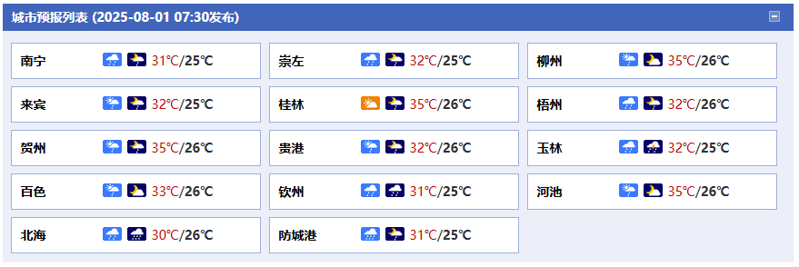 南寧市:今天白天到晚上有小到中雨、局地大雨到暴雨,偏南風(fēng)2級(jí),最高氣溫32℃,最低氣溫25℃。