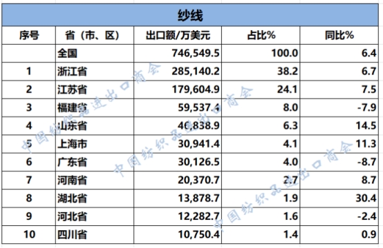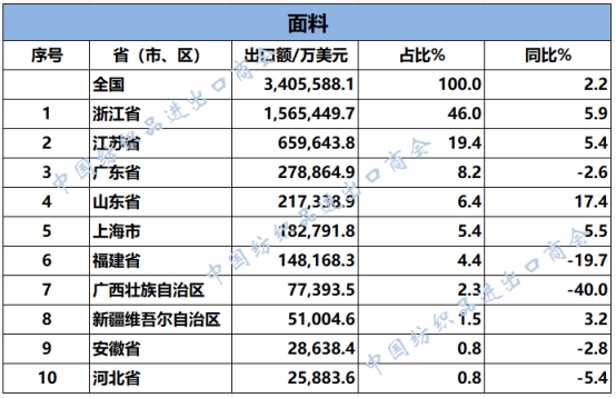 2025年1-6月紡織服裝類重點商品出口前十名的省(市、區(qū))