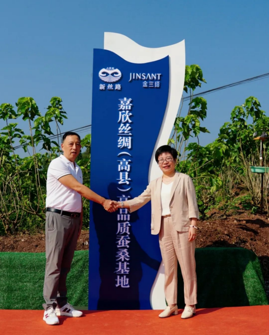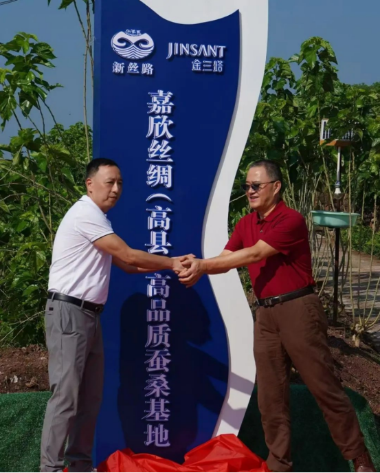 隨著紅綢揭落,3米高的雙面立牌正式亮相,“嘉欣絲綢(高縣)高品質(zhì)蠶桑基地”在盛夏綠意中格外醒目。