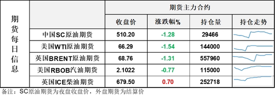 【1】WTI主力原油期貨收跌1.04美元,跌幅1.54%,報66.29美元/桶;布倫特主力原油期貨收跌0.91美元,跌幅1.31%,報68.76美元/桶;INE原油期貨收跌1.28%,報510.2元。