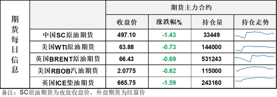 【1】WTI主力原油期貨收跌0.47美元,跌幅0.73%,報(bào)63.88美元/桶;布倫特主力原油期貨收跌0.46美元,跌幅0.69%,報(bào)66.43美元/桶;INE原油期貨收跌1.43%,報(bào)497.1元。