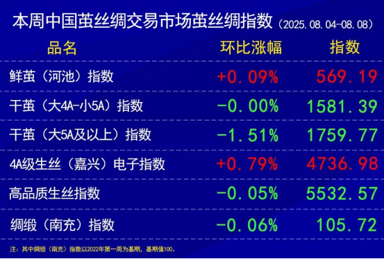 高品質(zhì)生絲價(jià)格本周延續(xù)強(qiáng)勢震蕩格局,但成交表現(xiàn)仍顯平淡,本周生絲指數(shù)環(huán)比微幅收綠,整體保持基本持平。