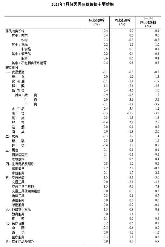 2025年7月份,全國(guó)居民消費(fèi)價(jià)格同比持平。其中,城市持平,農(nóng)村下降0.3%;食品價(jià)格下降1.6%,非食品價(jià)格上漲0.3%;消費(fèi)品價(jià)格下降0.4%,服務(wù)價(jià)格上漲0.5%。1—7月平均,全國(guó)居民消費(fèi)價(jià)格比上年同期下降0.1%。