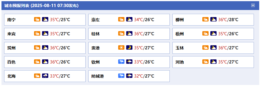 南寧市:今天白天到晚上,多云到晴、午后局地有陣雨或雷雨;偏南風(fēng)1~2級,最高氣溫35℃,最低氣溫26℃。