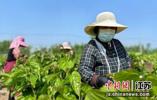 工人采摘鮮嫩桑葉,用于制作桑葉茶