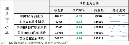 【1】WTI主力原油期貨收跌1.31美元,跌幅2.05%,報62.65美元/桶;布倫特主力原油期貨收跌1美元,跌幅1.5%,報65.63美元/桶;INE原油期貨收跌1.69%,報482.2元。