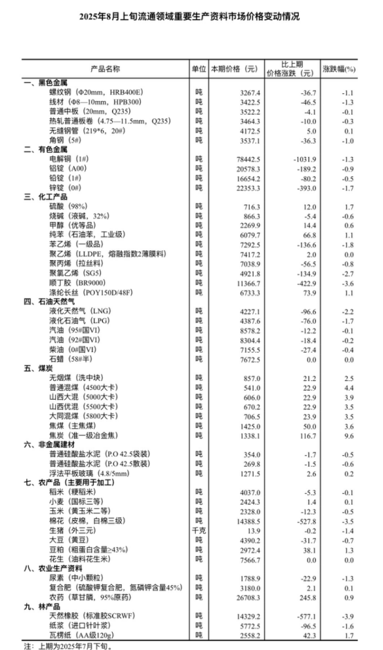 據對全國流通領域9大類50種重要生產資料市場價格的監(jiān)測顯示,2025年8月上旬與7月下旬相比,18種產品價格上漲,29種下降,3種持平。
