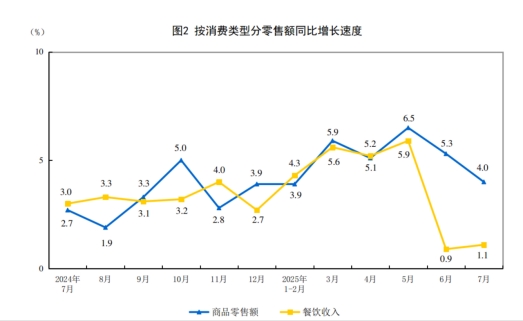 按消費(fèi)類型分,7月份,商品零售額34276億元,同比增長(zhǎng)4.0%;餐飲收入4504億元,增長(zhǎng)1.1%。1—7月份,商品零售額252254億元,增長(zhǎng)4.9%;餐飲收入31984億元,增長(zhǎng)3.8%。