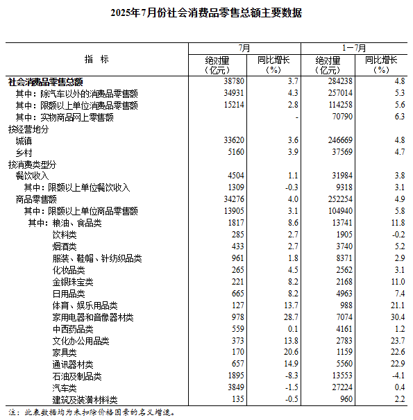 7月份,社會(huì)消費(fèi)品零售總額38780億元,同比增長(zhǎng)3.7%。其中,除汽車以外的消費(fèi)品零售額34931億元,增長(zhǎng)4.3%。1—7月份,社會(huì)消費(fèi)品零售總額284238億元,增長(zhǎng)4.8%。其中,除汽車以外的消費(fèi)品零售額257014億元,增長(zhǎng)5.3%。