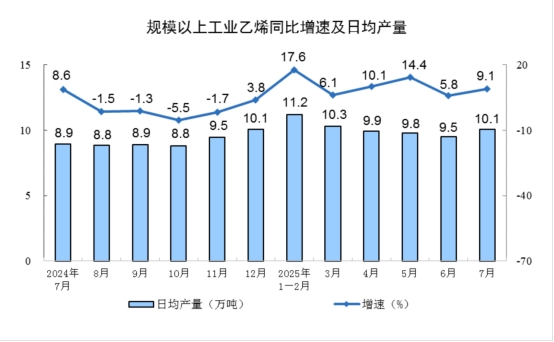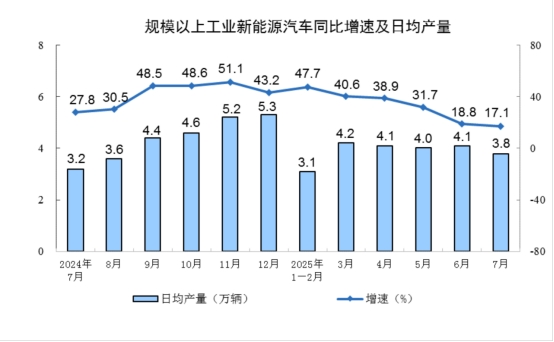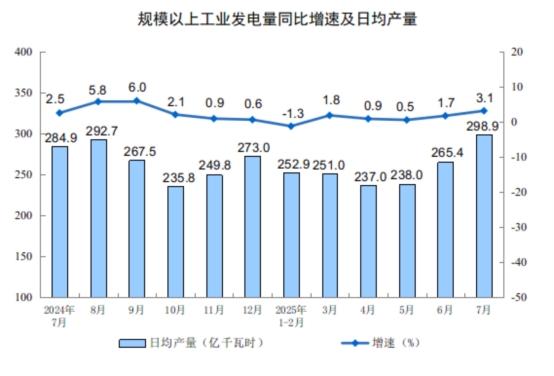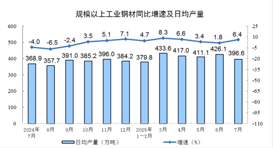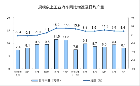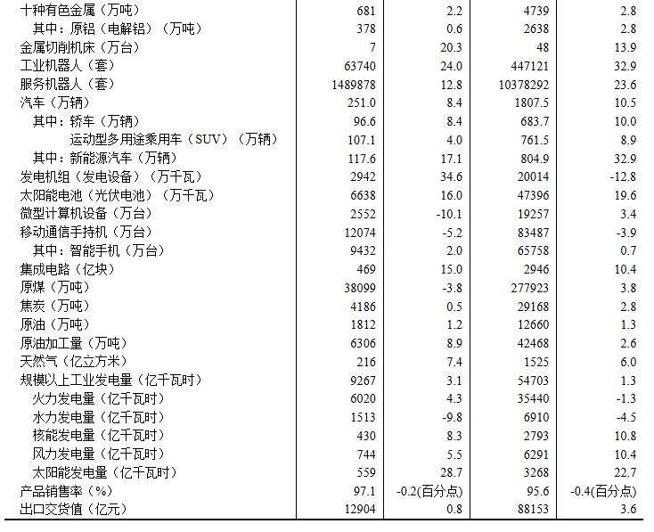 分產(chǎn)品看,7月份,規(guī)模以上工業(yè)623種產(chǎn)品中有335種產(chǎn)品產(chǎn)量同比增長。其中,鋼材12295萬噸,同比增長6.4%;水泥14557萬噸,下降5.6%;十種有色金屬681萬噸,增長2.2%;乙烯312萬噸,增長9.1%;汽車251.0萬輛,增長8.4%,其中新能源汽車117.6萬輛,增長17.1%;發(fā)電量9267億千瓦時,增長3.1%;原油加工量6306萬噸,增長8.9%。