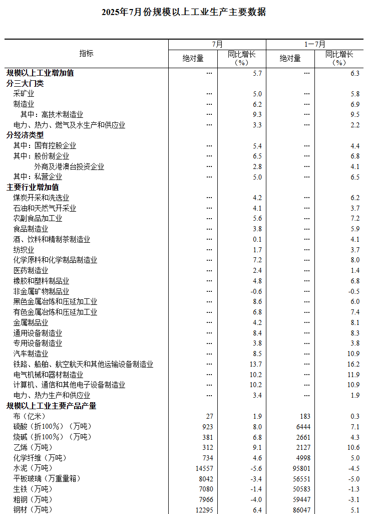 7月份,規(guī)模以上工業(yè)增加值同比實際增長5.7%(增加值增速均為扣除價格因素的實際增長率)。從環(huán)比看,7月份,規(guī)模以上工業(yè)增加值比上月增長0.38%。1—7月份,規(guī)模以上工業(yè)增加值同比增長6.3%。