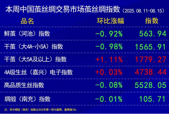 今日(2025年08月15日,周五)中國繭絲綢交易市場生絲電子指數(shù)微跌0.08%報收于4738.44點,本周生絲指數(shù)累計上漲0.03%。B絲2022D(商檢4A級生絲):250825合約報平收于47.16萬元;250925合約下跌0.06萬元報收于47.16萬元;260325合約下跌0.12萬元報收于47.64萬元。