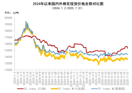 7月國內(nèi)棉花價格總體上漲,主要是宏觀氛圍向好、市場供應(yīng)預(yù)期偏緊對棉價形成利多影響。中央財經(jīng)委會議研究縱深推進(jìn)全國統(tǒng)一大市場建設(shè)、國家統(tǒng)計局公布我國上半年經(jīng)濟(jì)運(yùn)行情況、新疆發(fā)布進(jìn)一步完善紡織服裝產(chǎn)業(yè)政策措施等因素提振市場信心,疊加棉花商業(yè)庫存持續(xù)減少、部分產(chǎn)區(qū)遭遇不利天氣、進(jìn)口量顯著下降引發(fā)市場供應(yīng)減少擔(dān)憂,帶動國內(nèi)棉價持續(xù)上漲,月末因觀望中美貿(mào)易談判略有回落。同期,國際棉價受巴西和澳大利亞棉花豐產(chǎn)致市場供應(yīng)寬松、美國關(guān)稅政策的不確定抑制美棉出口需求等因素影響呈震蕩下跌走勢,整體弱于國內(nèi)。