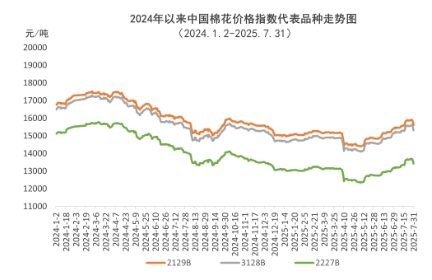 7月中國棉花價格指數(shù)沖高后小幅回落,受一系列宏觀消息和供應(yīng)趨緊預(yù)期推動,中國棉花價格指數(shù)震蕩上行,月中走高至15500元/噸上方。月末因美國對等關(guān)稅即將實(shí)施,商品市場整體回落,產(chǎn)業(yè)信心受挫,中國棉花價格指數(shù)下行至15325元/噸左右。7月中國棉花價格指數(shù)(CCIndex3128B)月均價為15362元/噸,環(huán)比上漲545元,同比下跌311元。