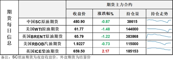 【1】WTI主力原油期貨收跌0.93美元,跌幅1.48%,報61.77美元/桶;布倫特主力原油期貨收跌0.81美元,跌幅1.22%,報65.79美元/桶;INE原油期貨收跌0.87%,報480.9元。