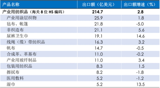 分產(chǎn)品來(lái)看,產(chǎn)業(yè)用涂層織物是行業(yè)出口金額最大的產(chǎn)品,出口額達(dá)到25.9億美元,同比增長(zhǎng)1.8%;氈布/帳篷的出口額為21.8億美元,同比下降5%;非織造布及其制品的海外需求整體保持穩(wěn)定,非織造布卷材的出口額為21.1億美元,同比增長(zhǎng)5.6%,一次性衛(wèi)生用品(尿褲、衛(wèi)生巾等)和濕巾的出口額分別達(dá)到19.1億美元和5.2億美元,分別同比增長(zhǎng)14.6%和13.5%,擦拭布(不含濕巾)和醫(yī)用敷料的出口額分別為8.2億美元和5.2億美元,分別同比下降1.8%和1.2%;傳統(tǒng)產(chǎn)品中,線繩(纜)帶紡織品、產(chǎn)業(yè)用玻纖制品、包裝用紡織品的出口有不同程度的增長(zhǎng),帆布和革基布的出口額增速小幅下降。