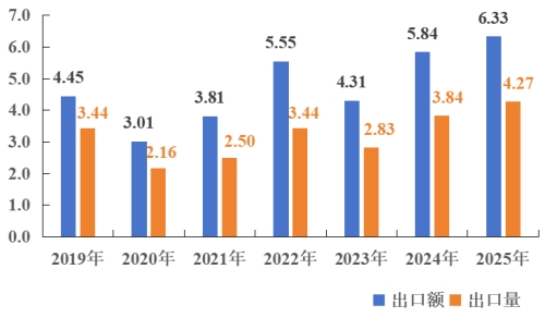 圖2 我國錦綸長絲織物2019年~2025年1~6月同期出口量額(億米/億美元)