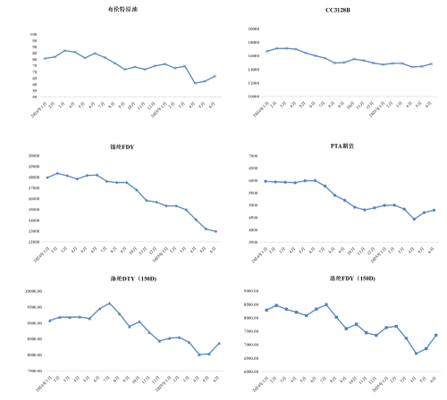 圖1為我國主要化纖長絲、棉花、PTA期貨及布倫特原油價格走勢變化情況。