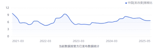 豬肉價(jià)格走勢進(jìn)一步反映市場需求疲軟與通縮壓力。近期豬價(jià)持續(xù)下滑,部分地區(qū)已跌入6元區(qū)。豬糧比呈現(xiàn)波動(dòng)下降趨勢,從2024年8月的8.44降至2025年5月的6.69。據(jù)發(fā)改委監(jiān)測,近日全國平均豬糧比價(jià)跌至6∶1以下。