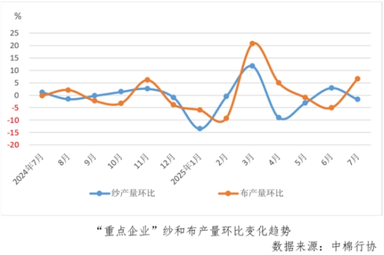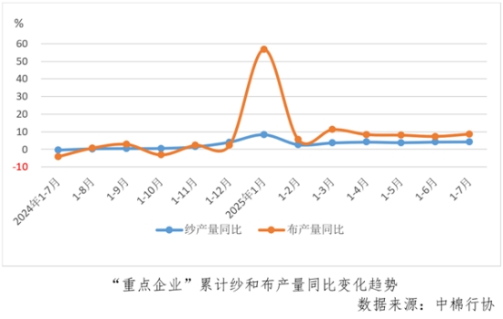 1-7份,“重點(diǎn)企業(yè)”紗產(chǎn)量同比增長4.2%,較1-6月份擴(kuò)大0.1個百分點(diǎn),布產(chǎn)量同比增長8.7%,較1-6月份擴(kuò)大1.3個百分點(diǎn)。7份紗產(chǎn)量環(huán)比下降1.7%,較6月份由增轉(zhuǎn)降,布產(chǎn)量環(huán)比增長6.6%,較6月份由降轉(zhuǎn)增。