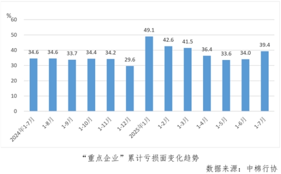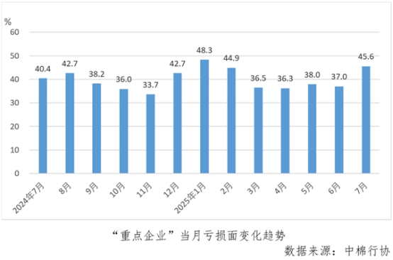 1-7月份,“重點(diǎn)企業(yè)”累計(jì)虧損面為39.4%,較1-6月份擴(kuò)大5.4個百分點(diǎn)。7月份當(dāng)月虧損面為45.6%,較6月擴(kuò)大8.5個百分點(diǎn),僅低于本年度1月份。