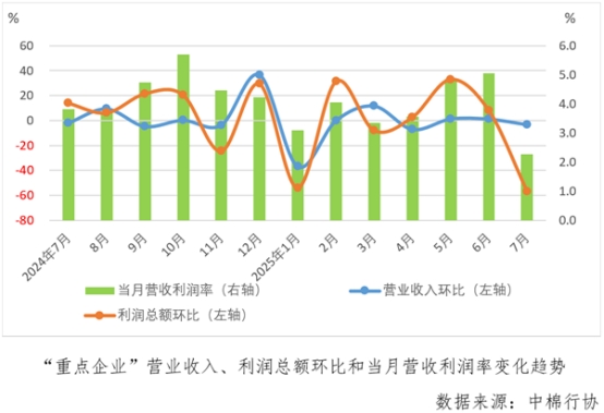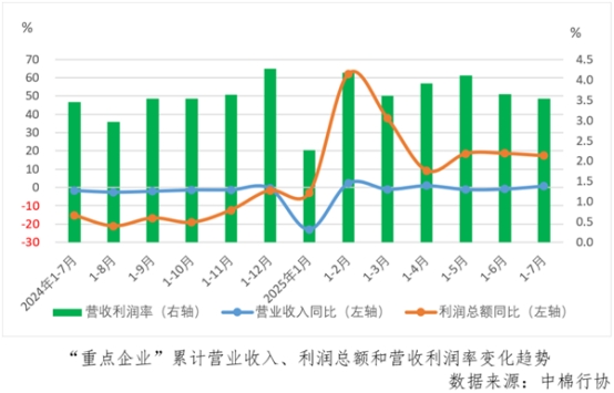 據(jù)中國棉紡織行業(yè)協(xié)會跟蹤的重點(diǎn)企業(yè)(以下簡稱“重點(diǎn)企業(yè)”)數(shù)據(jù), 1-7月份,“重點(diǎn)企業(yè)”營業(yè)收入同比增長0.8%,較1-6月份由降轉(zhuǎn)增,利潤總額同比增長17.3%,較1-6月份下降1.3個百分點(diǎn),營收利潤率為3.5%,較1-6月份下降0.1個百分點(diǎn),年內(nèi)僅高于1月份。
