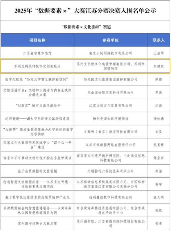 近日,2025年“數(shù)據(jù)要素×”大賽江蘇分賽區(qū)決賽入圍名單正式揭曉,蘇州文化數(shù)字化運(yùn)營管理有限公司、蘇州絲綢博物館聯(lián)合申報(bào)的“蘇州絲綢紋樣數(shù)字化創(chuàng)新應(yīng)用”項(xiàng)目成功晉級(jí)“數(shù)據(jù)要素×文化旅游”賽道決賽。