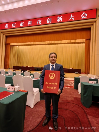 資源昆蟲全國重點實驗室完成的“家蠶泛基因組與重要性狀遺傳基礎(chǔ)研究”榮獲2024年度重慶市自然科學(xué)一等獎,成果負責人代方銀教授出席大會并上臺領(lǐng)獎。