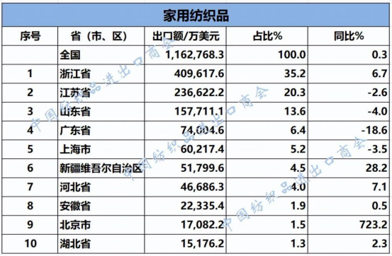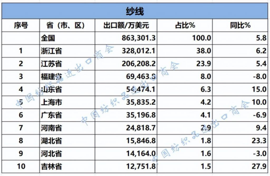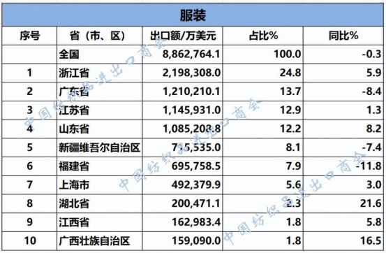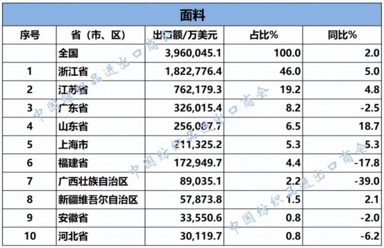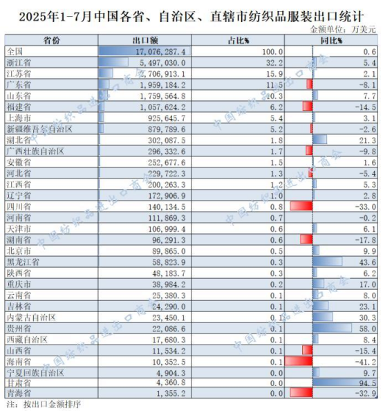2025年1—7月,我國紡織服裝累計出口1707.63億美元,同比增長0.6%。浙江省、江蘇省、廣東省、山東省、福建省分別列全國紡織服裝出口省市前五位,合計比重超七成。