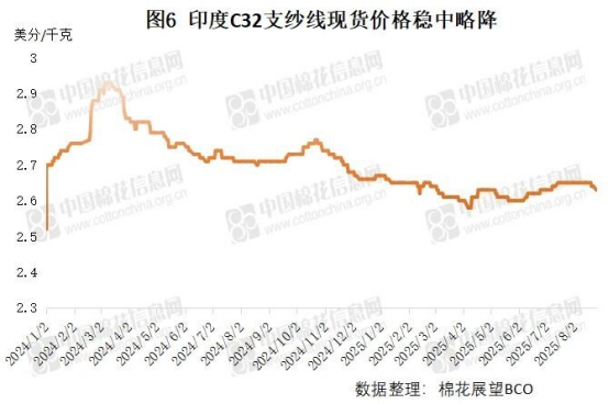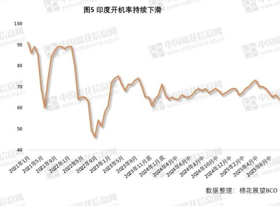 據(jù)調(diào)研數(shù)據(jù)顯示,自3月末以來,印度國內(nèi)開機率基本延續(xù)緩慢下滑的勢頭。從70%以上的開機率降至8月末的63%,用棉需求的疲態(tài)進一步證實了棉價下行的必然性。紗線價格上漲乏力,也削弱了下游對原料價格的接受能力。