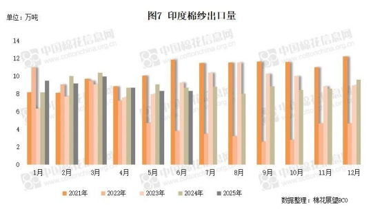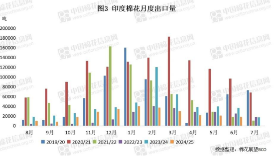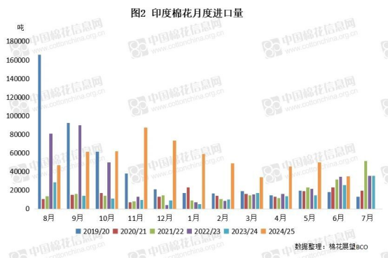 印度商務部數(shù)據(jù)顯示,2024/25年度(2024.8-2025.7)截至6月,印度棉花累計進口量達60.4萬噸,同比增加284.5%,處于歷史高位。同期棉花累計出口量僅27.0萬噸,同比減少44.3%,處于歷史低位。進口大幅增加而出口急劇減少,極大緩解了印度國內(nèi)棉花供需的結構性矛盾。