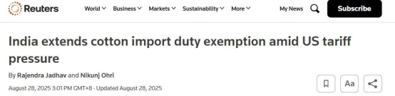 印度政府8月18日宣布,自8月19日至9月30日,全面免除棉花進口關稅及農(nóng)業(yè)附加稅。隨后在8月29日,又將免稅期限延長至12月31日。這一政策旨在支持受美國高額關稅影響的本地服裝業(yè),同時表明新德里愿意解決美國在農(nóng)業(yè)關稅方面的關切。