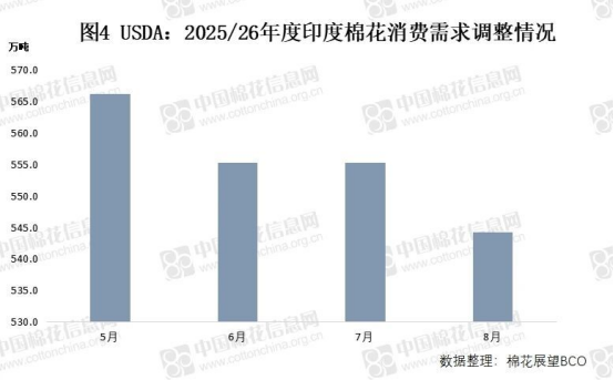 需求疲軟是印度棉花市場面臨的核心挑戰(zhàn)。美國對紡織品進口加征高額關稅后,印度棉花消費明顯放緩,出口訂單大幅減少。據(jù)USDA供需數(shù)據(jù),印度2025/26年度消費預期已從5月份566.1萬噸的歷史高位下調(diào)至544.3萬噸,累計下調(diào)約22萬噸。