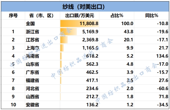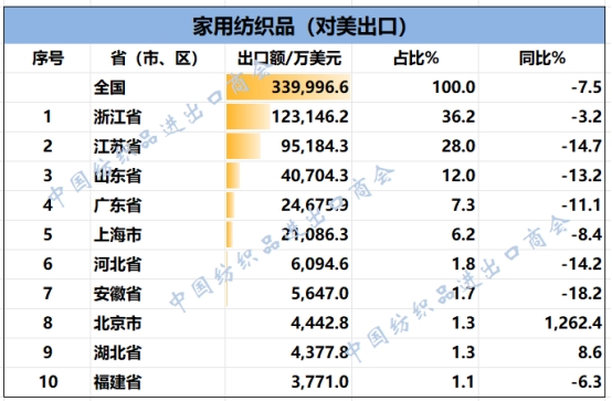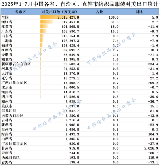 2025年1-7月,我國紡織服裝累計對美出口261.54億美元,同比下降5.9%。浙江省、江蘇省、廣東省、山東省、上海分別列全國紡織服裝對美出口省市前五位,合計比重超八成。