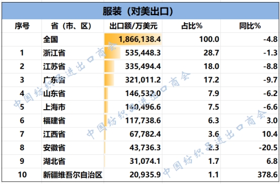 02、2025年1-7月,紡織服裝類重點商品對美出口前十名的省(市、區(qū))