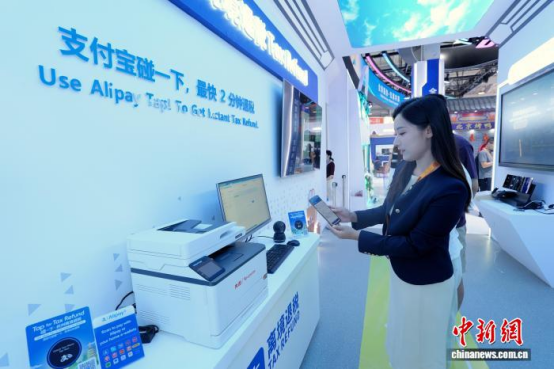 9月9日,北京首鋼園區(qū),一名媒體記者在2025年服貿(mào)會(huì)中國移動(dòng)展臺(tái)體驗(yàn)離境退稅服務(wù)