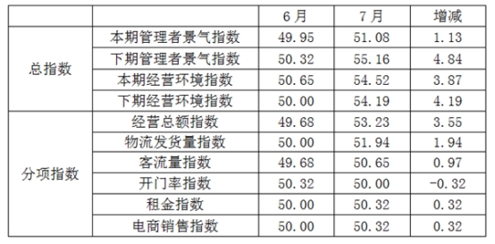 從商戶景氣指數(shù)來看,總指數(shù)中,8月商戶景氣指數(shù)為50.30,較上期上升0.62個百分點;經(jīng)營環(huán)境指數(shù)為52.47,較上期上升2.54個百分點。