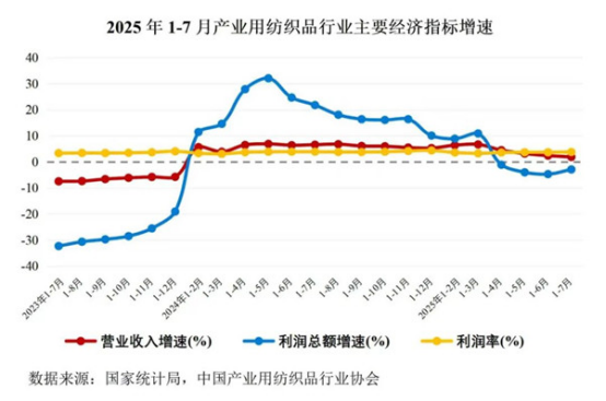 經(jīng)濟效益方面,根據(jù)國家統(tǒng)計局數(shù)據(jù),1-7月產(chǎn)業(yè)用紡織品行業(yè)規(guī)模以上企業(yè)的營業(yè)收入同比增長1.9%,利潤總額同比下降2.9%;營業(yè)利潤率為3.8%,同比下降0.2個百分點。行業(yè)企業(yè)利潤仍處于下降區(qū)間,但降幅有所收窄。