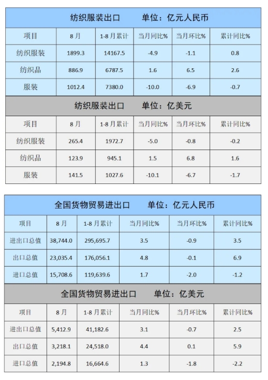 8月,紡織服裝出口1899.3億元,同比下降4.9%,環(huán)比下降1.1%,其中紡織品出口886.9億元,增長1.6%,環(huán)比增長6.5%,服裝出口1012.4億元,下降10%,環(huán)比下降6.9%。