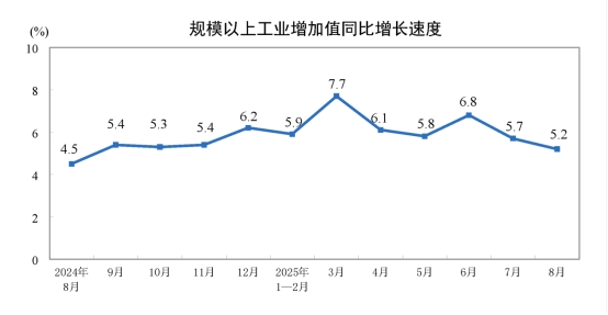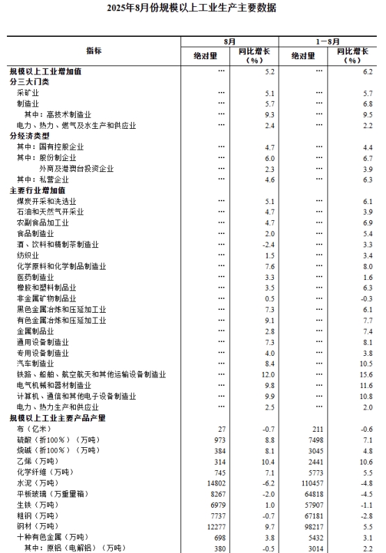 8月份,規(guī)模以上工業(yè)增加值同比實(shí)際增長(zhǎng)5.2%(增加值增速均為扣除價(jià)格因素的實(shí)際增長(zhǎng)率)。從環(huán)比看,8月份,規(guī)模以上工業(yè)增加值比上月增長(zhǎng)0.37%。1—8月份,規(guī)模以上工業(yè)增加值同比增長(zhǎng)6.2%。