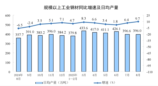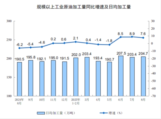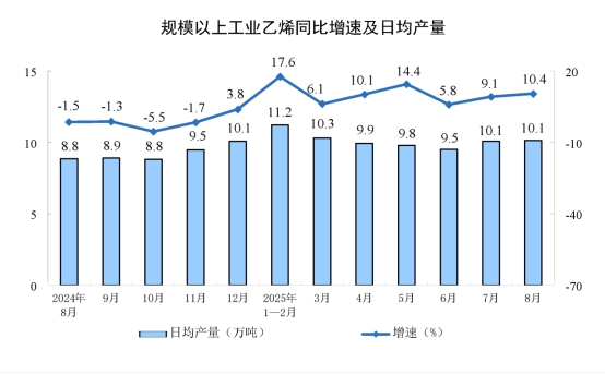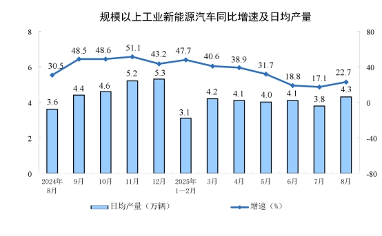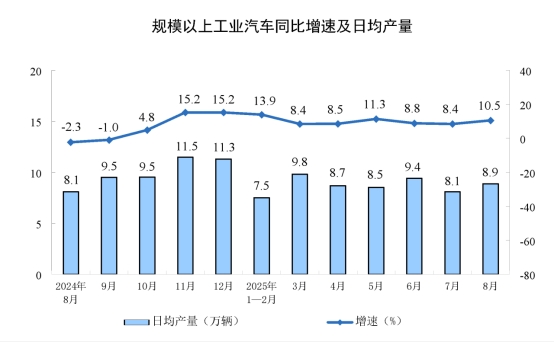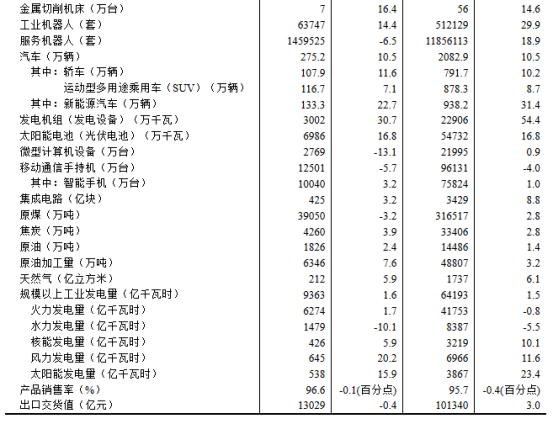 分產(chǎn)品看,8月份,規(guī)模以上工業(yè)623種產(chǎn)品中有319種產(chǎn)品產(chǎn)量同比增長(zhǎng)。其中,鋼材12277萬(wàn)噸,同比增長(zhǎng)9.7%;水泥14802萬(wàn)噸,下降6.2%;十種有色金屬698萬(wàn)噸,增長(zhǎng)3.8%;乙烯314萬(wàn)噸,增長(zhǎng)10.4%;汽車275.2萬(wàn)輛,增長(zhǎng)10.5%,其中新能源汽車133.3萬(wàn)輛,增長(zhǎng)22.7%;發(fā)電量9363億千瓦時(shí),增長(zhǎng)1.6%;原油加工量6346萬(wàn)噸,增長(zhǎng)7.6%。