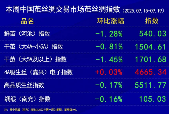 高品質(zhì)生絲價格指數(shù)方面,本周價格維穩(wěn)但整體有所下調(diào)成交一般的運(yùn)行特點(diǎn),市場仍在震蕩中探索后續(xù)發(fā)展的方向。