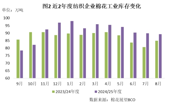 8月底,棉紡織企業(yè)棉花工業(yè)庫穩(wěn)中略降。其中紡織企業(yè)在庫棉花工業(yè)庫存量為89.2萬噸,環(huán)比減少0.6萬噸。紡織企業(yè)可支配棉花庫存量為115.3萬噸,環(huán)比減少5.3萬噸。年度末期,市場資源偏緊,適配資源有限,疊加現(xiàn)貨基差堅挺,企業(yè)采購謹慎,原料庫存小幅略有下降,部分中大型企業(yè)計劃新棉上市后再次補庫。其中:15.2%的企業(yè)增加棉花庫存,26.1%減少庫存,58.7%基本保持不變。