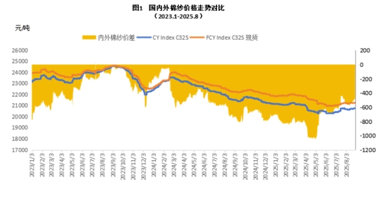 本月,內(nèi)外棉紗價格均價環(huán)比上漲,國產(chǎn)32支純棉紗8月均價為20693元/噸,環(huán)比上漲108元/噸,漲幅0.5%,同比下跌1026元/噸,跌幅4.7%;進口32支純棉紗8月均價21227元/噸,環(huán)比上漲96元/噸,漲幅0.5%,同比下跌1152元/噸,跌幅5.2%。