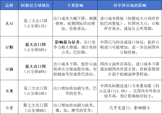 此外國際競爭格局改變,阿根廷農產品出口成本大幅降低(理想情況下約降低24.5%),使其在國際市場上更具價格優(yōu)勢。美國大豆出口將雪上加霜,面臨更直接的競爭。巴西雖是目前中國主要大豆供應國,也可能被迫調整報價。