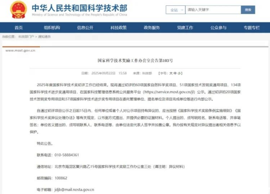 據(jù)悉,通過初評的60項國家自然科學獎項目、51項國家技術發(fā)明獎通用項目、134項國家科學技術進步獎通用項目,在國家科技管理信息系統(tǒng)公共服務平臺(https://service.most.gov.cn/jl)公示。通過初評的20項國家技術發(fā)明獎專用項目和37項國家科學技術進步獎專用項目在委托管理單位、提名單位及項目完成單位等進行內部公示。